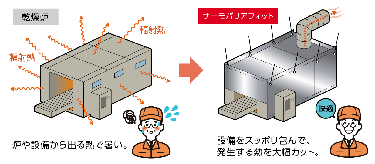 工場内の炉周辺は作業者にとって熱中症の危険が高まる場所です。乾燥炉や焼成炉などの設備からの熱放射は、作業環境を厳しくしエネルギーの無駄遣いにもつながります。こうした設備からの輻射熱を効果的にカットするためにも遮熱シートは有効です。