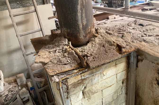 長年使用していると、炉内の耐火物が劣化してボロボロに崩れることがある。それが煙道に堆積することで、排気ができなくなりバーナの給気不足が起こり不完全燃焼になることもある。