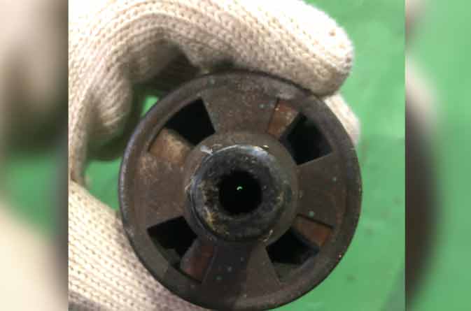 モータが逆回転になっていたことで、給気がほぼ無い状態であったが、循環ブロアによってダクト内は空気が流れている為バーナは燃焼するものの、炎の色は真っ黄色になり不完全燃焼に。さらにバーナの燃焼筒には炭のようなススが形成されていた。